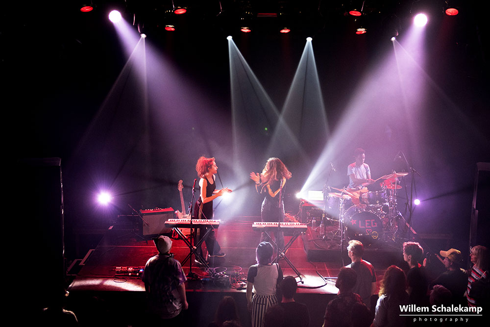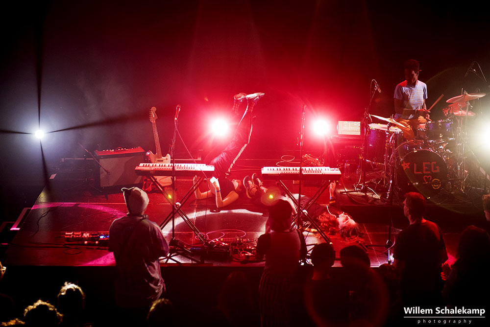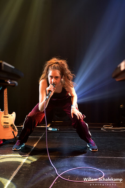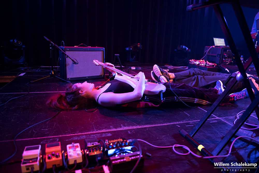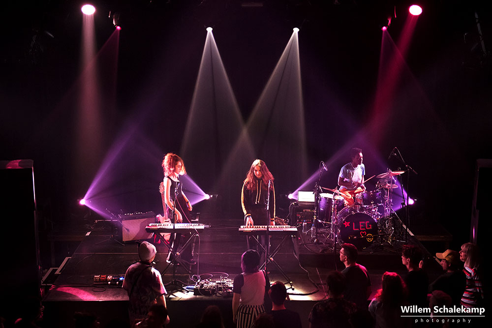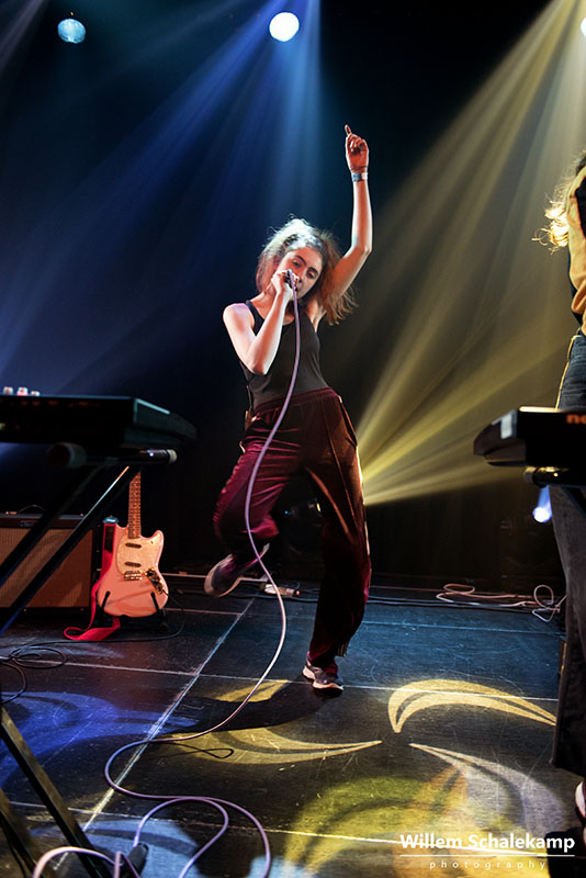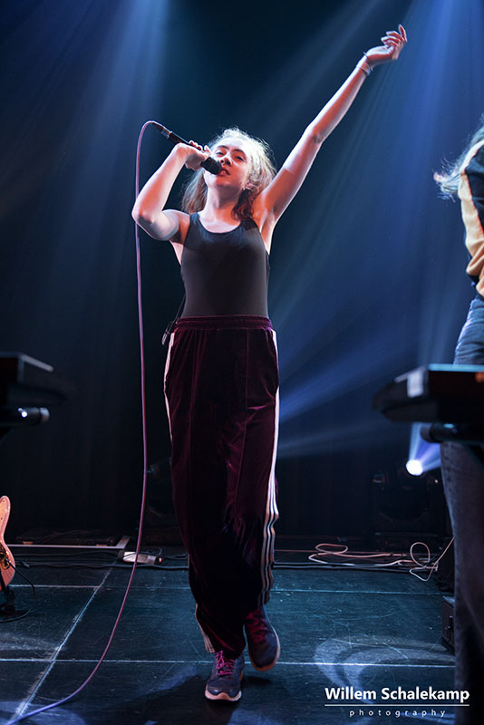 Let’s Eat Grandma bestaat uit Rosa Walton en Jenny Hollingworth, twee jeugdvriendinnen die vanaf hun veertiende jaar samen muziek begonnen te schrijven. In 2016 brachten ze hun debuutalbum uit, ‘I, Gemeni’. Filmische, avant-gardistische folk verweven met de hoge stemmen van de meisjes. De release van hun tweede album, ‘I’m All Ears’, staat gepland op 29 juni. Nog geen promotie voor dit album dus vanavond in de theaterzaal van de Melkweg, maar meer een tussendoortje van 45 minuten waarmee ze hun tour afsluiten. Maar dat maakt het optreden niet minder boeiend. Of vervreemdend, net hoe je het ervaart. Want bijzonder zijn de vriendinnen zeker. Live ondersteund door een drummer liggen ze regelmatig languit op de vloer, zitten achter hun keyboards of dansen spontaan door het publiek heen. Maar dit alles met een zekere afstand, zonder echt contact te maken. Dit is hun duistere droomwereld. Het publiek laat zich daarin meevoeren.