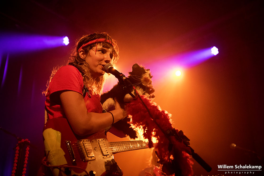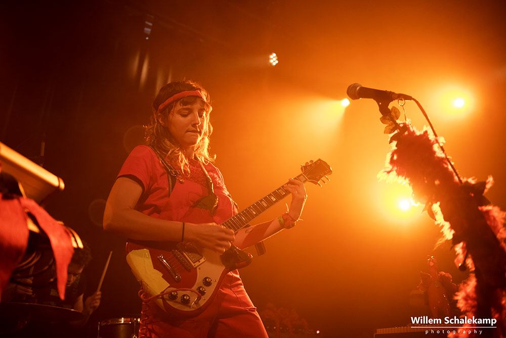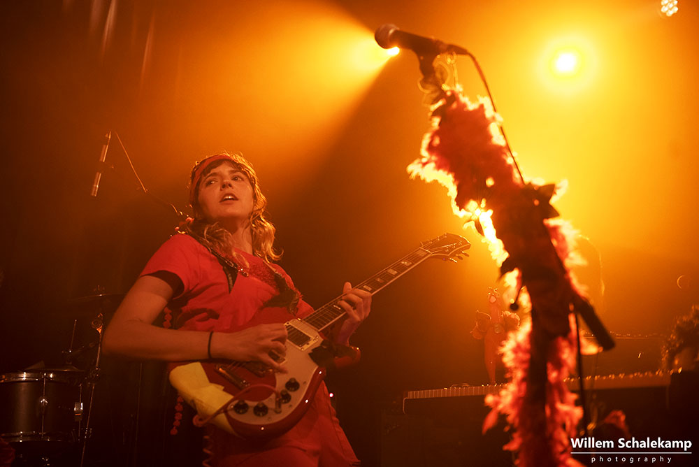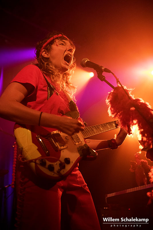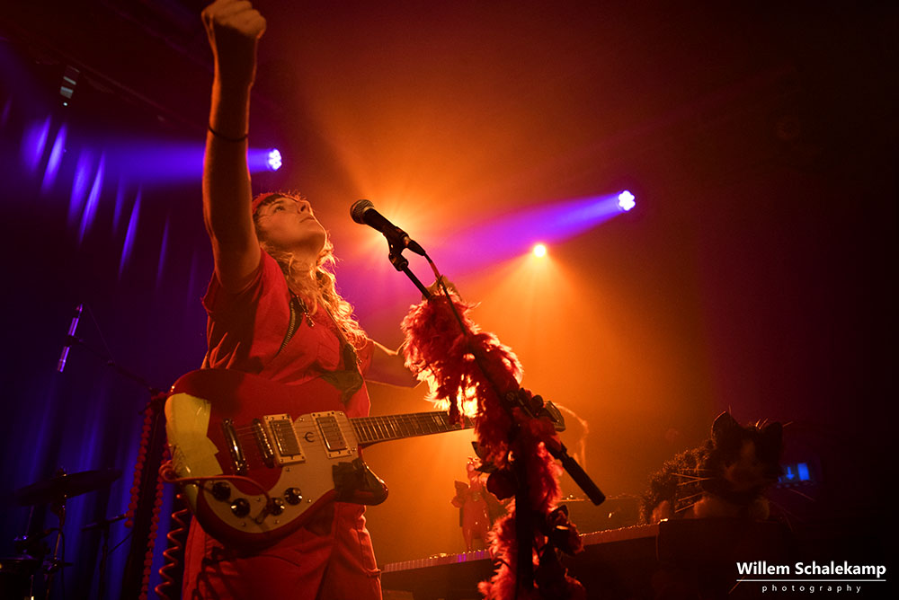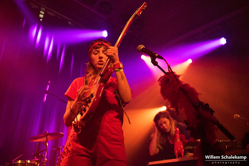 De Amerikaanse Caroline Rose maakt catchy indiepop liedjes en bracht dit jaar haar tweede album ‘Loner’ uit. Zoals altijd volledig in het rood gekleed stond ze met band, plastic kip en fluffy kat voor het eerst op Europese bodem in de bovenzaal van Paradiso en pakte deze met veel (wrange) humor in. Zondag 8 juli kun je haar nog zien op het Metropolis festival in Rotterdam. Grijp die kans!