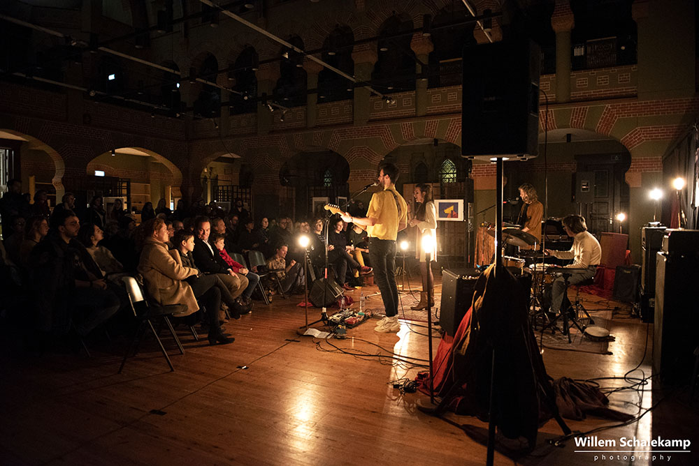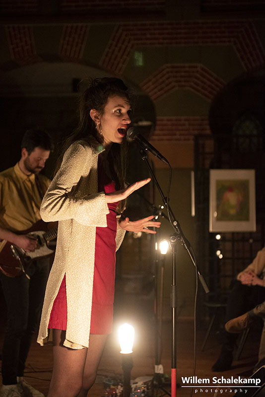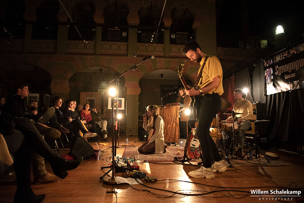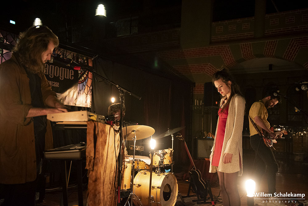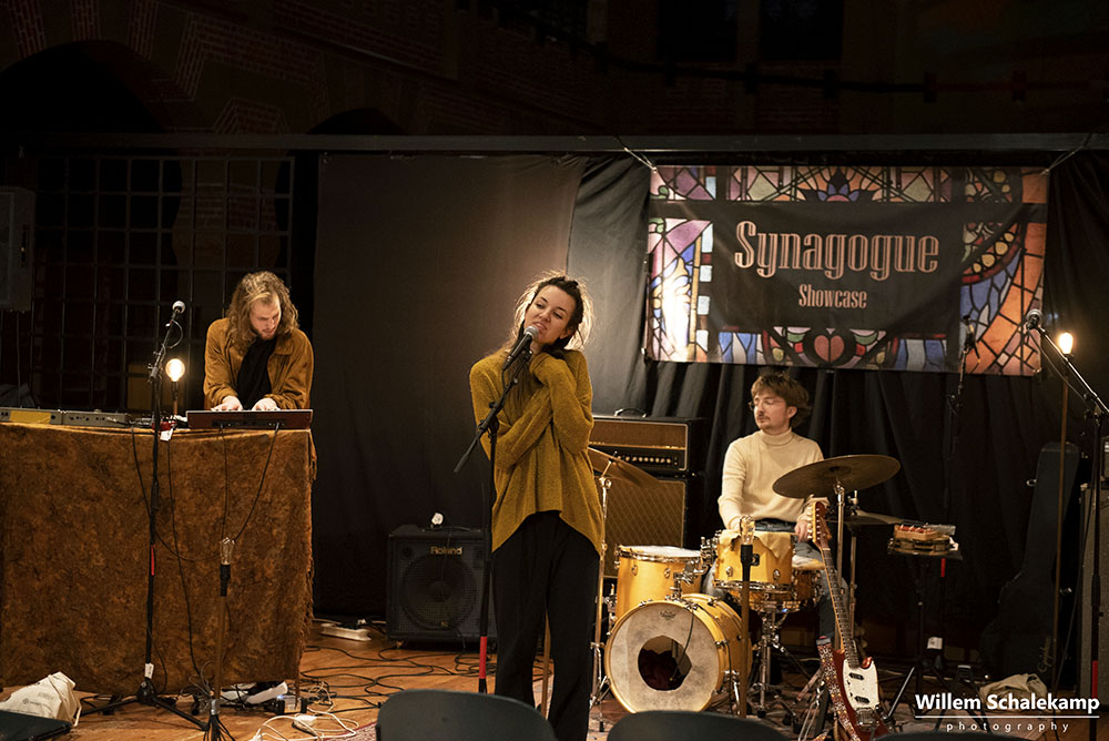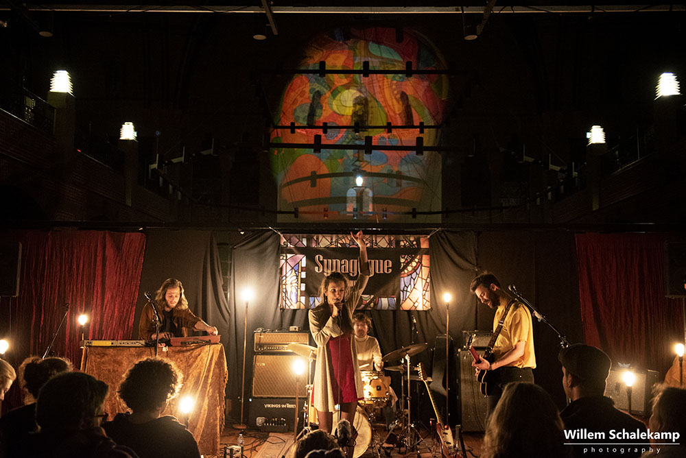 Showcase festival Eurosonic Noorderslag heeft deze dagen de binnenstad van Groningen weer overgenomen. Naast het reguliere programma van het festival is er ook een uitgebreid, meestal gratis toegankelijk, randprogramma. Zo presenteert Vikings in Tibet voor het derde jaar op rij een gevarieerd programma onder de titel Synagogue Showcase. In de goed gevulde synagoge zong en vertelde Milou Mignon met band haar luisterliedjes van o.a. haar aankomende EP ‘Stadskoraal’. Altijd op zoek naar verbinding. Ontwapenend mooi!