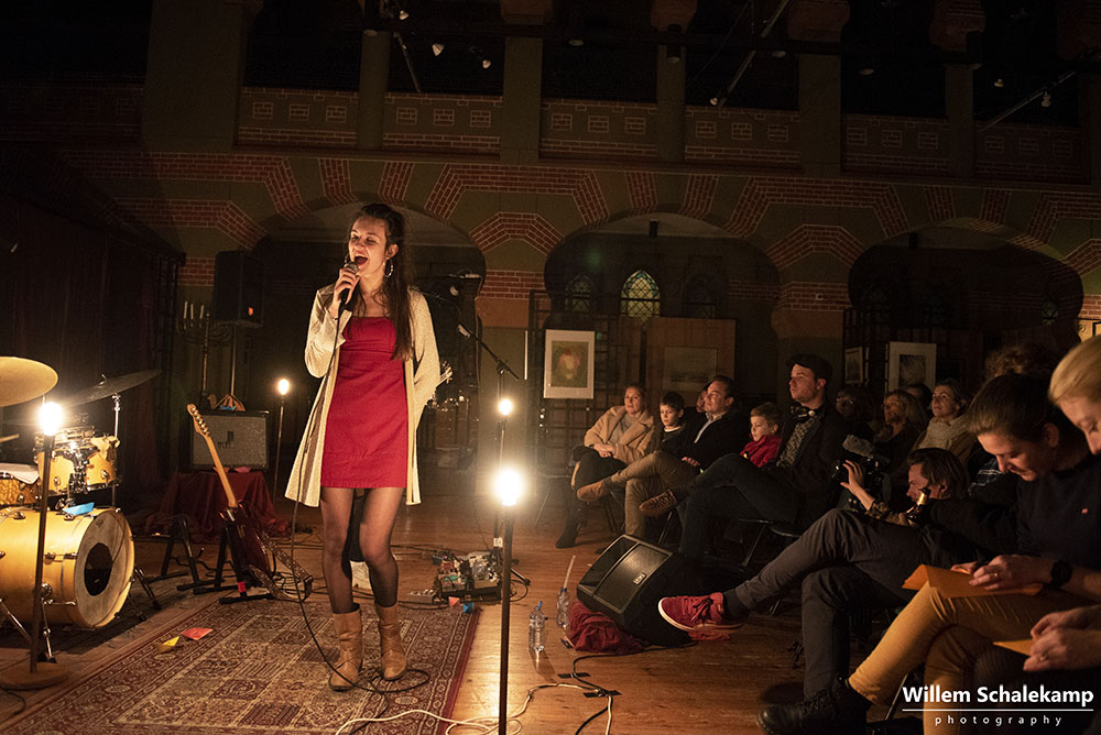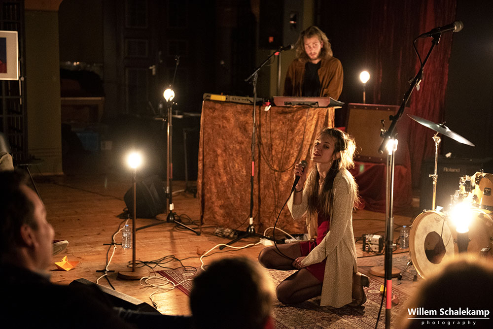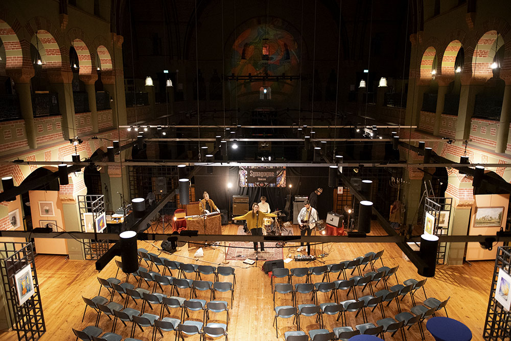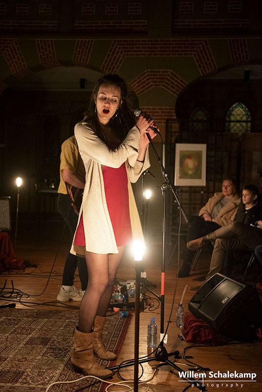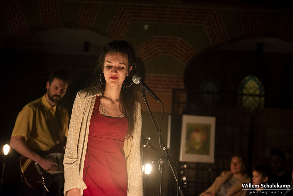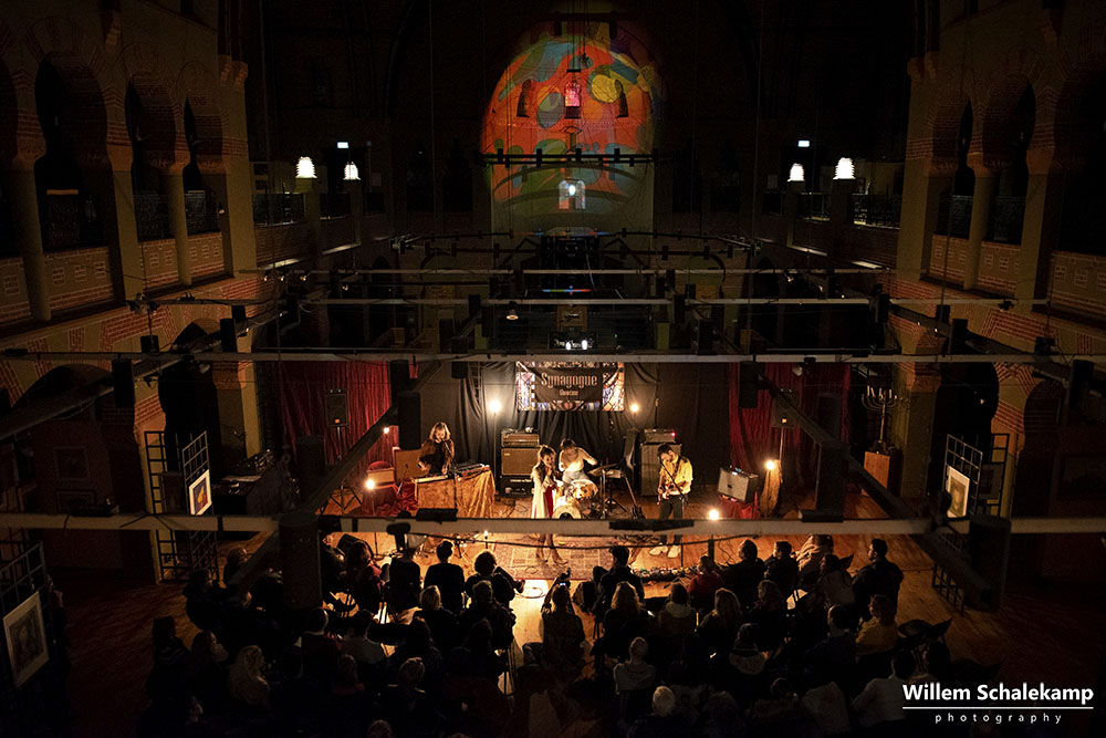 Showcase festival Eurosonic Noorderslag heeft deze dagen de binnenstad van Groningen weer overgenomen. Naast het reguliere programma van het festival is er ook een uitgebreid, meestal gratis toegankelijk, randprogramma. Zo presenteert Vikings in Tibet voor het derde jaar op rij een gevarieerd programma onder de titel Synagogue Showcase. In de goed gevulde synagoge zong en vertelde Milou Mignon met band haar luisterliedjes van o.a. haar aankomende EP ‘Stadskoraal’. Altijd op zoek naar verbinding. Ontwapenend mooi!
