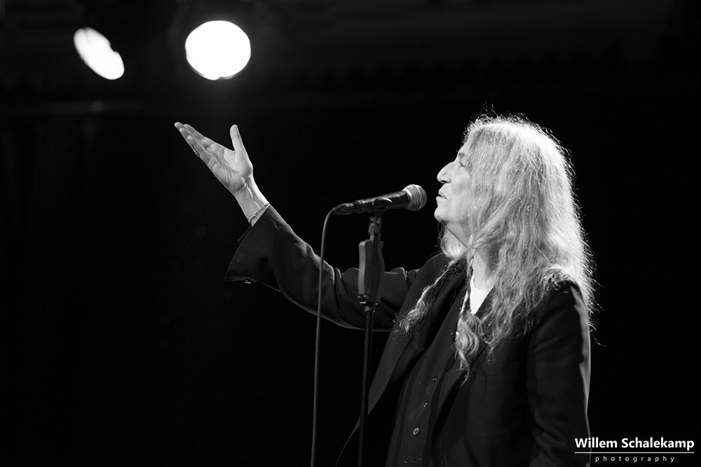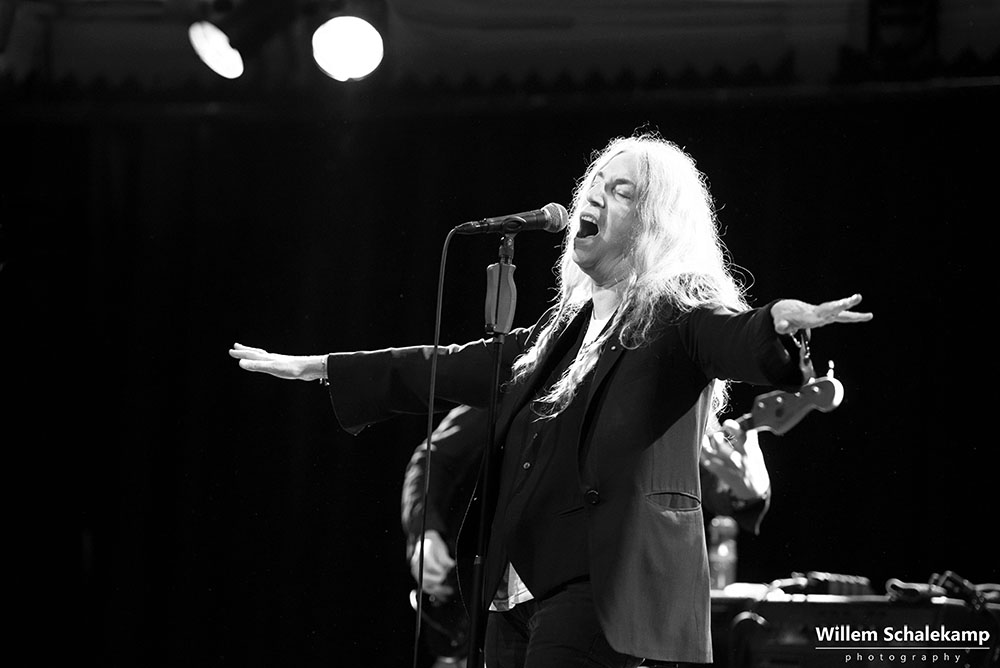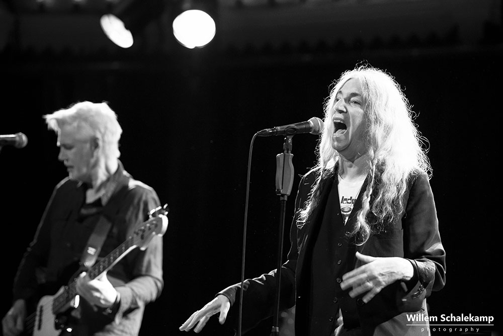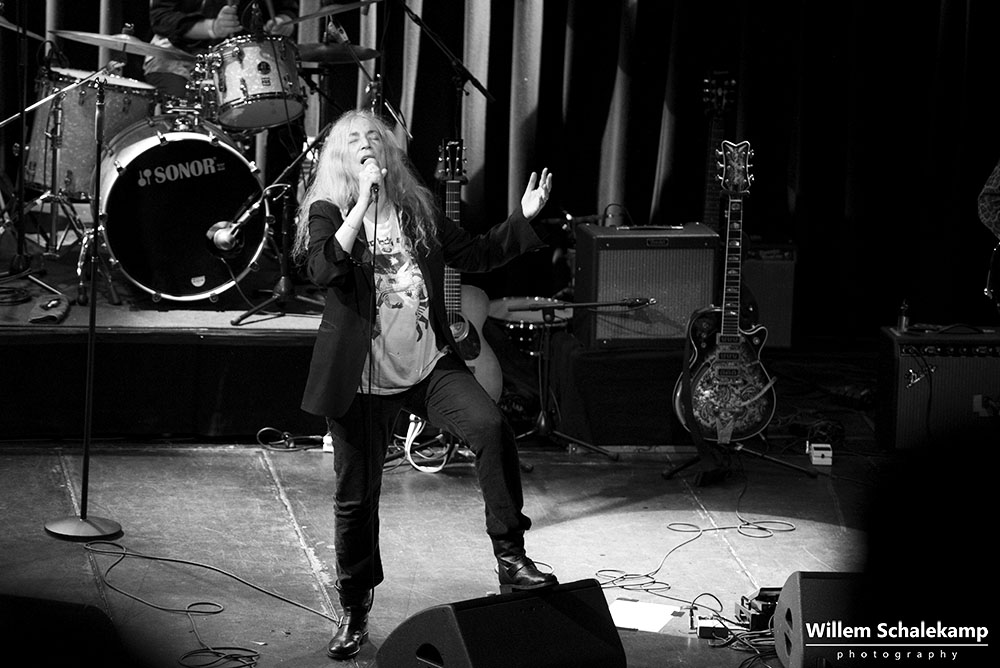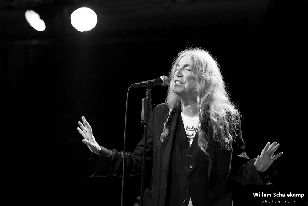 Patti Smith is weer voor twee uitverkochte avonden terug in haar geliefde ‘Paradisio’. De eerste avond was een behoorlijk felle set waar de 75 jarige Godmother of Punk voluit ging met haar stem en energie. Zoon Jackson Smith mocht bij afwezigheid van Lenny Kaye naar hartenlust soleren met zijn gitaarpartijen. Pas bij het laatste nummer voor de toegift, Gloria, verscheen Lenny op het podium. Oh ja, leg vooral niets op het podium waarvan jij denkt dat Patti dat interessant zou moeten vinden. Ze flikkert het er gewoon weer vanaf. ‘Dit is mijn podium en geen vuilnisbak!’ De beelden…