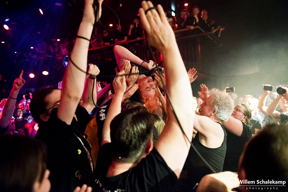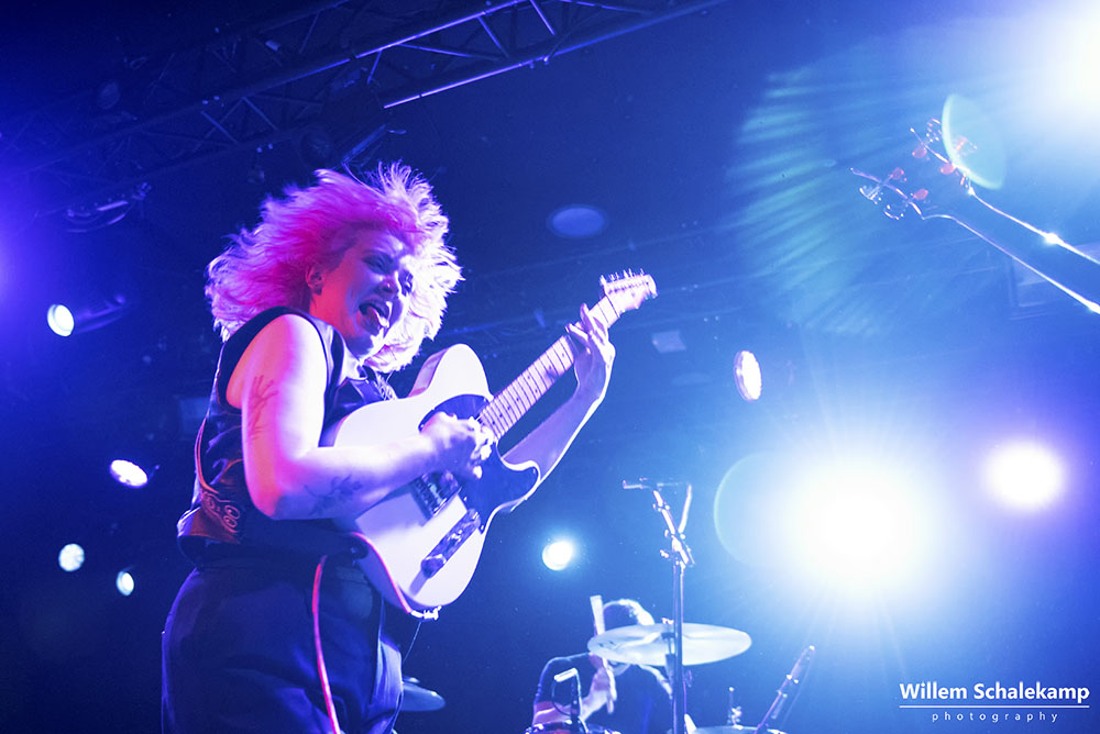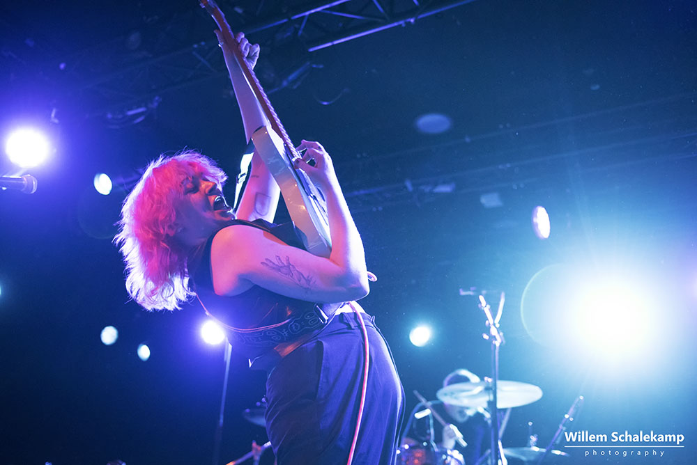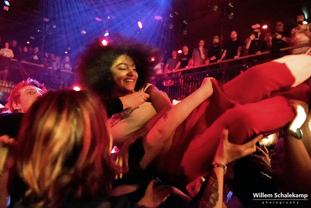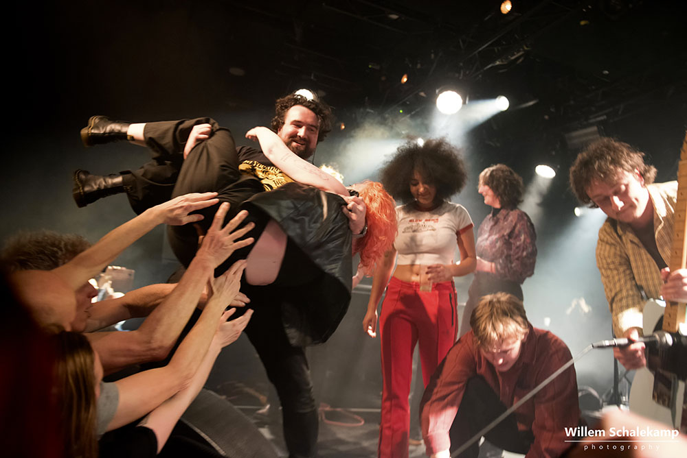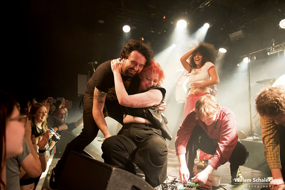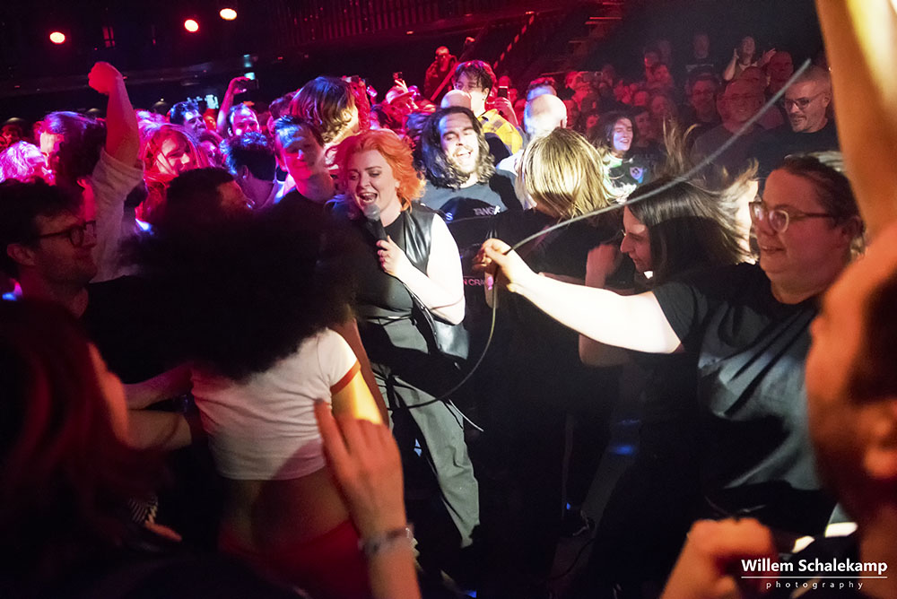 Voor de moshers was het even wachten, maar die konden meteen los vanaf het moment dat Karla Chubb en haar mannen van Sprints het podium betraden. Debuutalbum Letter To Self is net uit. Een intens garage punk album waarop Karla veel van haar jeugdervaringen, zoals opgroeien als queer in het conservatieve katholieke Dublin, bezingt. Ze praat, ze zingt, ze schreeuwt alles van zich af, maar tegelijkertijd spat ook het plezier van het podium af. Ze geniet van het publiek dat tekeer gaat in de zaal en duikt er uiteindelijk dan zelf ook tussen. Samen met Lily die met English Teacher tijdens het laatste nummer met Sprints meespeelt. Een memorabele avond!